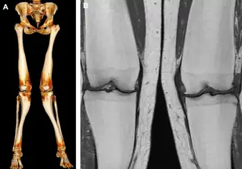 Metaphyseal dysplasia, or Pyle disease,[3] is a disorder of the bones. It is a rare disease in which the outer part of the shafts of long bones is thinner than normal and there is an increased chance of fractures. Its hallmark feature is an abnormality of the long bones in the arms and legs in which the ends (metaphyses) of the bones are abnormally broad; the shape of the bones resembles a boat oar or paddle. The broad metaphyses are due to enlargement of the spongy inner layer of bone (trabecular bone). Although trabecular bone is expanded, the dense outermost layer of bone (cortical bone) is thinner than normal. As a result, the bones are fragile and fracture easily. The bone abnormalities in the legs commonly cause knock knees (genu valgum) in affected individuals.
