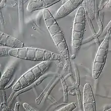 Microsporum gypseum is a soil-associated dermatophyte that occasionally is known to colonise and infect the upper dead layers of the skin of mammals.[1] The name refers to an asexual "form-taxon" that has been associated with four related biological species of fungi: the pathogenic taxa Arthroderma incurvatum, A. gypsea, A. fulva and the non-pathogenic saprotroph A. corniculata.[2][3] More recent studies have restricted M. gypseum to two teleomorphic species A. gypseum and A. incurvatum.[1][4] The conidial states of A. fulva and A. corniculata have been assigned to M. fulvum and M. boullardii.[5] Because the anamorphic states of these fungi are so similar, they can be identified reliably only by mating.[1] Two mating strains have been discovered, "+" and "–".[6] The classification of this species has been based on the characteristically rough-walled, blunt, club-shaped, multicelled macroconidia.[4] Synonyms include Achorion gypseum, Microsporum flavescens, M. scorteum, and M. xanthodes.[1][5] There has been past nomenclatural confusion in the usage of the generic names Microsporum and Microsporon.[7]