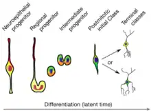 During embryonic development, the mammalian central nervous system (CNS; brain and spinal cord) is derived from the neural tube, which contains NSCs that will later generate neurons.[3] However, neurogenesis doesn't begin until a sufficient population of NSCs has been achieved. These early stem cells are called neuroepithelial cells (NEC)s, but soon take on a highly elongated radial morphology and are then known as radial glial cells (RGC)s.[3] RGCs are the primary stem cells of the mammalian CNS, and reside in the embryonic ventricular zone, which lies adjacent to the central fluid-filled cavity (ventricular system) of the neural tube.[5][6] Following RGC proliferation, neurogenesis involves a final cell division of the parent RGC, which produces one of two possible outcomes. First, this may generate a subclass of neuronal progenitors called intermediate neuronal precursors (INP)s, which will divide one or more times to produce neurons. Alternatively, daughter neurons may be produced directly. Neurons do not immediately form neural circuits through the growth of axons and dendrites. Instead, newborn neurons must first migrate long distances to their final destinations, maturing and finally generating neural circuitry. For example, neurons born in the ventricular zone migrate radially to the cortical plate, which is where neurons accumulate to form the cerebral cortex.[5][6] Thus, the generation of neurons occurs in a specific tissue compartment or 'neurogenic niche' occupied by their parent stem cells.