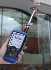Sound can be measured in the air using a sound level meter, a device consisting of a microphone, an amplifier, and a time meter.[26] Sound level meters can measure noise at different frequencies (usually A- and C-weighted levels).[14] There are two settings for response time constants, fast (time constant = 0.125 seconds, similar to human hearing) or slow (1 second, used for calculating averages over widely varying sound levels).[14] Sound level meters meet the required standards set by the International Electrotechnical Commission (IEC)[27] and in the United States, the American National Standards Institute as type 0, 1, or 2 instruments.[28]