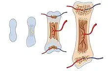 Ossification (also called osteogenesis or bone mineralization) in bone remodeling is the process of laying down new bone material by cells named osteoblasts. It is synonymous with bone tissue formation.[1] There are two processes resulting in the formation of normal, healthy bone tissue:[2] Intramembranous ossification is the direct laying down of bone into the primitive connective tissue (mesenchyme), while endochondral ossification involves cartilage as a precursor.