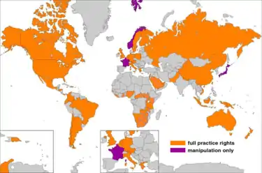 - ↑ "International Practice Rights Map". American Osteopathic Association. Archived from the original on 2016-08-19. Retrieved 1 July 2012.
