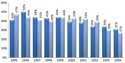 Osteopathic physicians have historically entered primary care fields at a higher rate than their MD counterparts. Some osteopathic organizations make claims to a greater emphasis on the importance of primary care within osteopathic medicine. However, the proportion of osteopathic students choosing primary care fields, like that of their MD peers, is declining.[67] Currently, only one in five osteopathic medical students enters a family medicine residency (the largest primary care field).[68] In 2004, only 32% of osteopathic seniors planned careers in any primary care field; this percentage was down from a peak in 1996 of more than 50%.[66]