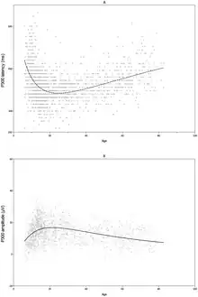 P300 latency and amplitude trajectories across the lifespan as obtained from the cross-sectional dataset. Dots represent scores from individual participants. From From P300 Development across the Lifespan: A Systematic Review and Meta-Analysis.[1] The latency and amplitude of the P300 response may vary as a function of age.