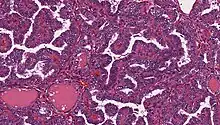 Histopathology of a thyroid papillary carcinoma.