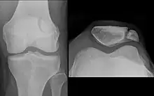 Diagnosis is based on symptoms and examination, which typically reveals a swollen knee with reduced movement and a tender kneecap.[5] A fracture is subsequently confirmed with X-rays usually taken from different angles.[3] In children an MRI may be required.[3]