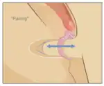 In men, there is a risk of penile rupture if the penis is bent when erect. This is a case of medical emergency.[76][77][78] According to studies (2017 and 2022), accidents in which the man suffers a penile fracture occur predominantly in the doggy style position, but a careless movement by the woman on top can also inflict such a serious injury on the man.[79][80] One of the causes is the penis slipping out of the vagina and, during the next thrusting movement, forcefully hitting an area of the vulva under which her pubis bone and the pubic symphysis are, when the penis suddenly gets bent downwards. In the missionary position such accidents are rare. Unsuitable angles and changes of position of one or both partners can also lead to severe misstrain of the penile corpus cavernosum and thus to a penile rupture.[81][82][83]