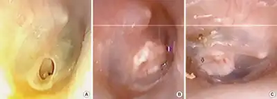 2. Endoscopic tympanoplasty, usually using the endoscope through the ear canal without the need for incision. This technique was introduced and popularized by Professor Tarabichi of TSESI: Tarabichi Stammberger Ear and Sinus Institute.[15]