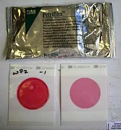 The Neogen Petrifilm plate is an all-in-one plating system made by the Food Safety Division of the Neogen Corporation. They are heavily used in many microbiology-related industries and fields to culture various micro-organisms and are meant to be a more efficient method for detection and enumeration compared to conventional plating techniques. A majority of its use is for the testing of foodstuffs.
