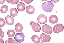 Polychromasia is a disorder where there is an abnormally high number of immature red blood cells found in the bloodstream as a result of being prematurely released from the bone marrow during blood formation (poly- refers to many, and -chromasia means color.) These cells are often shades of grayish-blue. Polychromasia is usually a sign of bone marrow stress as well as immature red blood cells. 3 types are recognized, with types 1 and 2 being referred to as 'young red blood cells' and type 3 as 'old red blood cells'. Giemsa stain is used to distinguish all three types of blood smears.[1] The young cells will generally stain gray or blue in the cytoplasm. These young red blood cells are commonly called reticulocytes. All polychromatophilic cells are reticulocytes, however, not all reticulocytes are polychromatophilic. In the old blood cells, the cytoplasm either stains a light orange or does not stain at all.