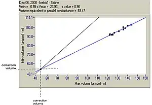 To take into account the parallel conductance, GP, the most common method involves injection of hypertonic saline into the subject—enough to temporarily reduce blood resistance, and therefore increase preload, but not so much as to alter haemodynamics. The minimum and maximum volumes (Vmax and Vmin) from each loop in the series of loops are plotted on a graph. Vmax and Vmin lines are extrapolated and at their point of intersection, where Vmax is equal to Vmin, must be zero—conductance is parallel conductance only. The volume at this point is the correction volume.