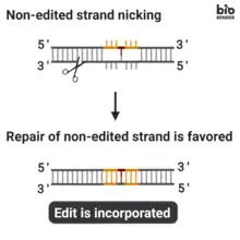 Despite its increased efficacy, the edit inserted by PE2 might still be removed due to DNA mismatch repair of the edited strand. To avoid this problem during DNA heteroduplex resolution, an additional single guide RNA (sgRNA) is introduced. This sgRNA is designed to match the edited sequence introduced by the pegRNA, but not the original allele. It directs the Cas9 nickase portion of the fusion protein to nick the unedited strand at a nearby site, opposite to the original nick. Nicking the non-edited strand causes the cell's natural repair system to copy the information in the edited strand to the complementary strand, permanently installing the edit.[1] However, there are drawbacks to this system as nicking the unaltered strand can lead to additional undesired indels. [9]