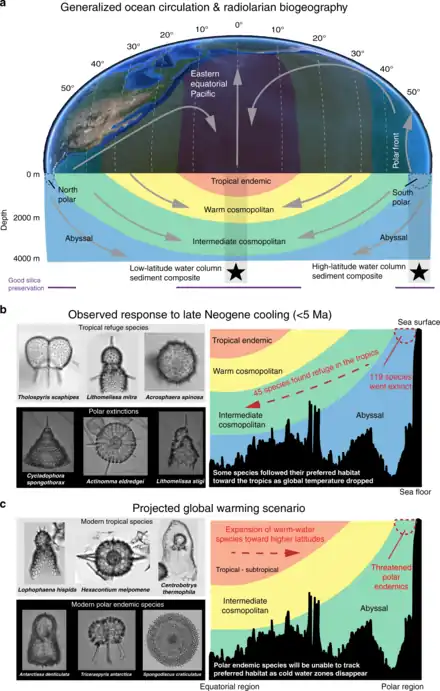 In the diagram on the right, a Illustrates generalized radiolarian provinces [10][11] and their relationship to water mass temperature (warm versus cool color shading) and circulation (gray arrows). Due to high-latitude water mass submergence under warm, stratified waters in lower latitudes, radiolarian species occupy habitats at multiple latitudes, and depths throughout the world oceans. Thus, marine sediments from the tropics reflect a composite of several vertically stacked faunal assemblages, some of which are contiguous with higher latitude surface assemblages. Sediments beneath polar waters include cosmopolitan deep-water radiolarians, as well as high-latitude endemic surface water species. Stars in (a) indicate the latitudes sampled, and the gray bars highlight the radiolarian assemblages included in each sedimentary composite. The horizontal purple bars indicate latitudes known for good radiolarian (silica) preservation, based on surface sediment composition.[12][13]