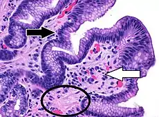 - Foveolar hyperplasia (black arrow), as a tortuosity in the "neck" region of the gastric glands.