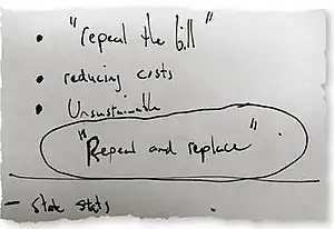 Notecard from the Republican brain-storming session on which the "Repeal and replace" slogan originated, March 2010