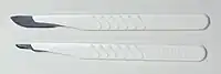 ![]() Various scalpels. The first (from left), second, and fourth have replaceable blades. The fifth is a lancet. | |