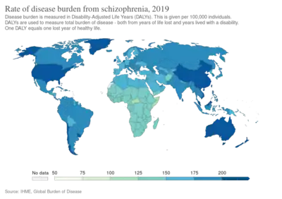 - ↑ Charlson FJ, Ferrari AJ, Santomauro DF, et al. (17 October 2018). "Global Epidemiology and Burden of Schizophrenia: Findings From the Global Burden of Disease Study 2016". Schizophrenia Bulletin. 44 (6): 1195–1203. doi:10.1093/schbul/sby058. PMC 6192504. PMID 29762765.