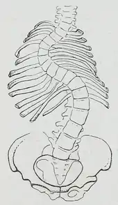 - ↑ Kouwenhoven JW, Castelein RM (December 2008). "The pathogenesis of adolescent idiopathic scoliosis: review of the literature". Spine. 33 (26): 2898–908. doi:10.1097/BRS.0b013e3181891751. PMID 19092622.