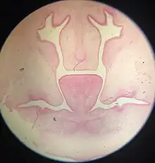 Frontal section of nasal cavities of a human embryo 28 mm. long (Kollmann) at about forty-four days. The two palatine processes can be seen here post-elevation in a horizontal position. The medial edges of the palatine processes are yet to fuse and form the roof of the oral cavity.