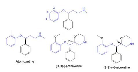 The aryloxy propylamine moiety is also found in many other monoamine reuptake inhibitors, but the placement of substituents on the phenyl ring determine the selectivity. Compounds with substituents in position 2’ have selectivity for NET. Compounds with substituents in position 4’ are selective serotonin reuptake inhibitors e.g. fluoxetine and paroxetine. Then there is duloxetine which has a phenyl group attached at positions 2’ and 3’ and has a similar affinity for both transporters.[23]