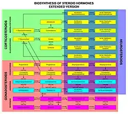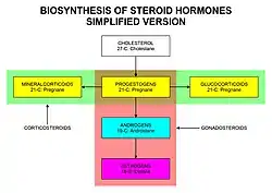 Sex hormones, also known as sex steroids, gonadocorticoids and gonadal steroids, are steroid hormones that interact with vertebrate steroid hormone receptors.[1] The sex hormones include the androgens, estrogens, and progestogens. Their effects are mediated by slow genomic mechanisms through nuclear receptors as well as by fast nongenomic mechanisms through membrane-associated receptors and signaling cascades.[2] The polypeptide hormones luteinizing hormone, follicle-stimulating hormone and gonadotropin-releasing hormone – each associated with the gonadotropin axis – are usually not regarded as sex hormones, although they play major sex-related roles.