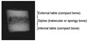 The bones of the skull are in three layers: the hard compact layer of the external table (lamina externa), the diploë (a spongy layer of red bone marrow in the middle, and the compact layer of the inner table (Lamina interna).[26]