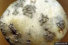 At least four other species of Streptomyces also cause diseases on potato tubers.[8] The most widespread species other than S. scabiei are S. turgidiscabies and S. acidiscabies, which can be distinguished based on their morphology, the way they utilise food sources and their 16S RNA sequences.[2] Unlike S. scabiei, S. acidiscabies is predominantly seed-borne rather than soil-borne and be suppressed using insecticides and nematicides, suggesting that microfauna play a role in its transmission.[13] In 2003 three other species of Streptomyces that cause common scab symptoms were isolated in Korea and named S. luridiscabiei, S. puniciscabiei and S. niveiscabiei. They differ from S. scabiei by having spores that are of different colours.[14] S. ipomoea causes a similar disease on sweet potato tubers.[15]