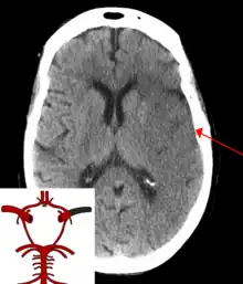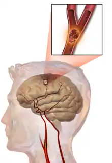The main risk factor for stroke is high blood pressure.[6] Other risk factors include tobacco smoking, obesity, high blood cholesterol, diabetes mellitus, a previous TIA, end-stage kidney disease, and atrial fibrillation.[2][6][7] An ischemic stroke is typically caused by blockage of a blood vessel, though there are also less common causes.[12][13][14] A hemorrhagic stroke is caused by either bleeding directly into the brain or into the space between the brain's membranes.[12][15] Bleeding may occur due to a ruptured brain aneurysm.[12] Diagnosis is typically based on a physical exam and supported by medical imaging such as a CT scan or MRI scan.[8] A CT scan can rule out bleeding, but may not necessarily rule out ischemia, which early on typically does not show up on a CT scan.[9] Other tests such as an electrocardiogram (ECG) and blood tests are done to determine risk factors and rule out other possible causes.[8] Low blood sugar may cause similar symptoms.[8]