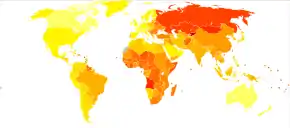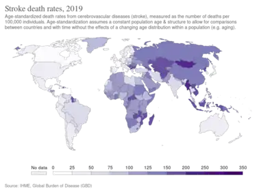 In 2013 approximately 6.9 million people had an ischemic stroke and 3.4 million people had a hemorrhagic stroke.[16] In 2015 there were about 42.4 million people who had previously had a stroke and were still alive.[10] Between 1990 and 2010 the number of strokes which occurred each year decreased by approximately 10% in the developed world and increased by 10% in the developing world.[17] In 2015, stroke was the second most frequent cause of death after coronary artery disease, accounting for 6.3 million deaths (11% of the total).[11] About 3.0 million deaths resulted from ischemic stroke while 3.3 million deaths resulted from hemorrhagic stroke.[11] About half of people who have had a stroke live less than one year.[2] Overall, two thirds of strokes occurred in those over 65 years old.[17]