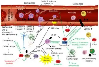 Hemorrhagic strokes are classified based on their underlying pathology. Some causes of hemorrhagic stroke are hypertensive hemorrhage, ruptured aneurysm, ruptured AV fistula, transformation of prior ischemic infarction, and drug-induced bleeding.[61] They result in tissue injury by causing compression of tissue from an expanding hematoma or hematomas. In addition, the pressure may lead to a loss of blood supply to affected tissue with resulting infarction, and the blood released by brain hemorrhage appears to have direct toxic effects on brain tissue and vasculature.[43][62] Inflammation contributes to the secondary brain injury after hemorrhage.[62]
