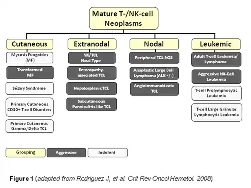 - ↑ Rodríguez J, Conde E, Gutiérrez A, et al. (July 2007). "Frontline autologous stem cell transplantation in high-risk peripheral T-cell lymphoma: a prospective study from The Gel-Tamo Study Group". Eur. J. Haematol. 79 (1): 32–8. doi:10.1111/j.1600-0609.2007.00856.x. PMID 17598836.