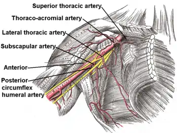 ![]() The axillary artery and its branches (superior throracic artery is the upper-rightmost artery) | |