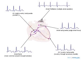 | Types | Atrial fibrillation, paroxysmal supraventricular tachycardia (PSVT), atrial flutter, Wolff-Parkinson-White syndrome[2] |