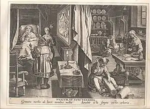The Flemish artist Stradanus designed a print called Preparation and Use of Guayaco for Treating Syphilis, a scene of a wealthy man receiving treatment for syphilis with the tropical wood guaiacum sometime around 1590.[100]