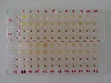 In the test, red blood cells (erythrocytes) are sensitized with antigens from T. pallidum pallidum. The cells then aggregate on the surface of a test dish if exposed to the serum of a patient with syphilis. It is used as a confirmatory test for syphilis infection. A negative test result shows a tight button or spot of red blood cells on the surface of the test dish. Often a plastic test plate containing many small "wells" is used as the test dish so that many patients may be tested at the same time but their results can be kept separate from each other. Please note the image (Fig 1) of the wells on the test plate and the positive and negative test results look different.[1]