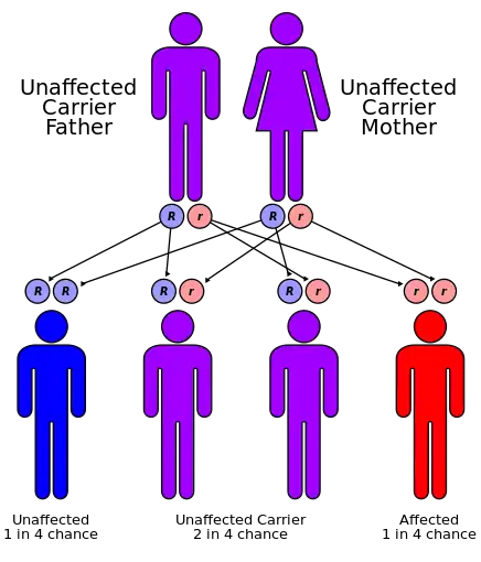 Tay–Sachs disease is an autosomal recessive genetic disorder, meaning that when both parents are carriers, there is a 25% risk of giving birth to an affected child with each pregnancy. The affected child would have received a mutated copy of the gene from each parent.[8]