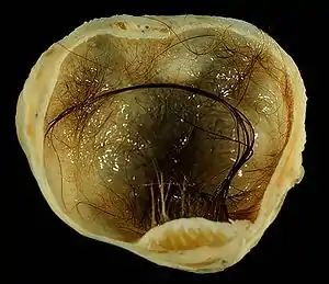 A dermoid cyst is a mature cystic teratoma containing hair (sometimes very abundant) and other structures characteristic of normal skin and other tissues derived from the ectoderm. The term is most often applied to teratoma on the skull sutures and in the ovaries of females.