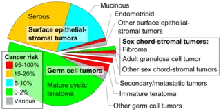 - Minor adjustment for mature cystic teratomas (0.17 to 2% risk of ovarian cancer): Mandal, Shramana; Badhe, Bhawana A. (2012). "Malignant Transformation in a Mature Teratoma with Metastatic Deposits in the Omentum: A Case Report". Case Reports in Pathology. 2012: 1–3. doi:10.1155/2012/568062. ISSN 2090-6781. PMC 3469088. PMID 23082264. - ↑ Orbital dermoid cyst at eMedicine