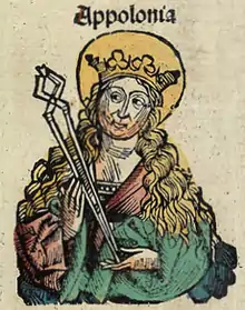 In Christianity, Saint Apollonia is the patron saint of toothache and other dental problems. She was an early Christian martyr who was persecuted for her beliefs in Alexandria during the Imperial Roman age. A mob struck her repeatedly in the face until all her teeth were smashed. She was threatened with being burned alive unless she renounced Christianity, but she instead chose to throw herself onto the fire. Supposedly, toothache sufferers who invoke her name will find relief.[60]