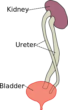 Kidney issues, such as horseshoe kidney, are sometimes observed in Turner syndrome.[34] Horseshoe kidney, where the kidneys are fused together in a U-shape, occurs in around 10% of Turner's cases compared to less than 0.5% of the general population. A missing kidney is observed in as many as 5% of individuals with Turner syndrome, compared to around 0.1% of the population. A duplicated ureter, where two ureters drain a single kidney, occurs in as much as 20%–30% of the Turner syndrome population. Kidney malformations in Turner syndrome may be more common in mosaicism than in the full 45,X0 karyotype.[36] Serious complications of the kidney anomalies associated with Turner syndrome are rare, although there is some risk of issues such as obstructive uropathy, where the flow of urine from the kidneys is blocked.[14]