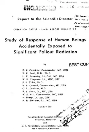 Between 1960 and 1971, the Department of Defense funded non-consensual whole body radiation experiments on mostly poor and Black cancer patients, who were not told what was being done to them. Patients were told that they were receiving a "treatment" that might cure their cancer, but the Pentagon was trying to determine the effects of high levels of radiation on the human body. One of the doctors involved in the experiments was worried about litigation by the patients. He referred to them only by their initials on the medical reports. He did this so that, in his words, "there will be no means by which the patients can ever connect themselves up with the report", to prevent "either adverse publicity or litigation".[92]