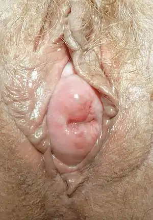 | Uterine prolapse in a 71-year-old woman, with the cervix visible in the vaginal opening. | |