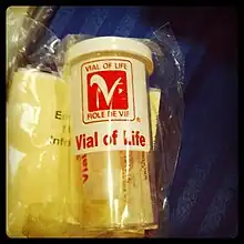 The Vial of Life (French: Fiole de vie),[1][2] also known as Vial of L.I.F.E. (Lifesaving Information for Emergencies) is a program that allows individuals to have their complete medical information ready in their home for emergency personnel to reference during an emergency. The program is used to provide the patient's medical information when a patient is not able to speak or remember this information. Vial of Life programs are commonly used by senior citizens and promoted by senior center organizations,[3] fire departments, and other community organizations.[4]