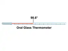 Temperature can be measured from the mouth, rectum, axilla (armpit), ear, or skin. Oral, rectal, and axillary temperature can be measured with either a glass or electronic thermometer.[11] Note that rectal temperature measures approximately 0.5 °C higher than oral temperature, and axillary temperature approximately 0.5 °C less than oral temperature.[12] Aural and skin temperature measurements require special devices designed to measure temperature from these locations.[11]