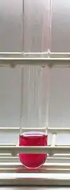 Voges–Proskauer /ˈfoʊɡəs ˈprɒskaʊ.ər/ or VP is a test used to detect acetoin in a bacterial broth culture. The test is performed by adding alpha-naphthol and potassium hydroxide to the Voges-Proskauer broth, which is a glucose-phosphate broth that has been inoculated with bacteria. A cherry red color indicates a positive result, while a yellow-brown color indicates a negative result.[1]