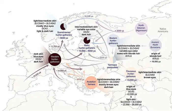 - ↑ Günther, Torsten; Malmström, Helena; Svensson, Emma M.; Omrak, Ayça; Sánchez-Quinto, Federico; Kılınç, Gülşah M.; Krzewińska, Maja; Eriksson, Gunilla; Fraser, Magdalena; Edlund, Hanna; Munters, Arielle R. (9 January 2018). "Population genomics of Mesolithic Scandinavia: Investigating early postglacial migration routes and high-latitude adaptation". PLOS Biology. 16 (1): e2003703. doi:10.1371/journal.pbio.2003703. ISSN 1545-7885. PMC 5760011. PMID 29315301. From supporting information document S8, page 5/28: "However, for all three well-characterized skin and eye-color associated SNPs, the SHGs display a frequency that is greater for the light-skin variants and the blue-eye variant than can be expected from a mixture of WHGs and EHGs. This observation indicates that the frequencies may have increased due to continued adaptation to a low light conditions."