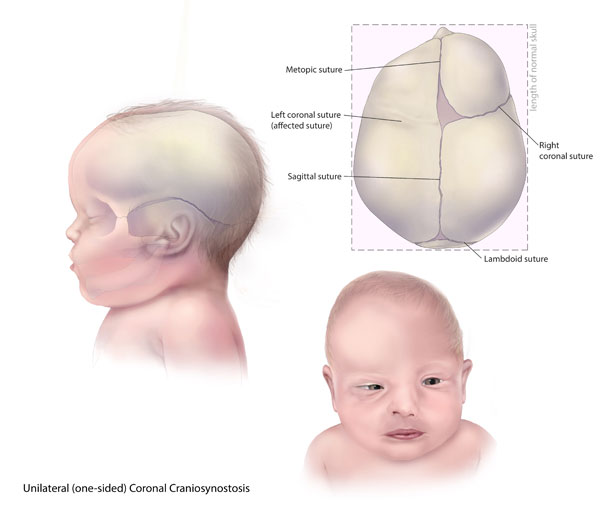 In people with craniofrontonasal syndrome, the skull bones along the coronal suture, which is the growth line that goes over the head from ear to ear, closes early. These changes can result in an abnormally shaped head and distinctive facial features. The size and shape of facial structures may differ between the right and left sides of the face (facial asymmetry) in individuals with craniofrontonasal syndrome. Affected individuals may also have wide-set eyes (ocular hypertelorism), eyes that do not point in the same direction (strabismus), involuntary eye movements (nystagmus), a slit (cleft) in the tip of the nose, a wide nasal bridge, an upper lip that points outward (called a tented lip), or a cleft in the upper lip with or without a cleft in roof of the mouth (palate). Some affected individuals have brain abnormalities, such as absent or underdeveloped tissue connecting the left and right halves of the brain (agenesis or dysgenesis of the corpus callosum). However, intelligence is usually unaffected in people with this condition. Females with craniofrontonasal syndrome typically have more severe signs and symptoms than affected males, who often have hypertelorism and rarely, cleft lip.