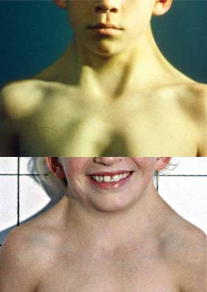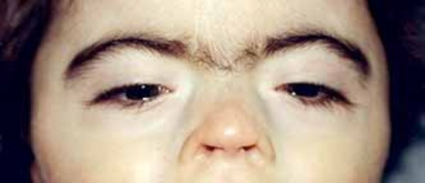 Other common features of craniofrontonasal syndrome include extra folds of skin on the neck (webbed neck), ridged nails, unusual curving of the fingers or toes (clinodactyly), extra fingers (polydactyly) or fingers that are fused together (syndactyly), low-set breasts, a sunken chest (pectus excavatum), a spine that curves to the side (scoliosis), or narrow and sloped shoulders with reduced range of motion. People with this condition may also have eyebrows that grow together in the middle (synophrys), a widow's peak hairline with a low hairline in the back, or wiry hair.