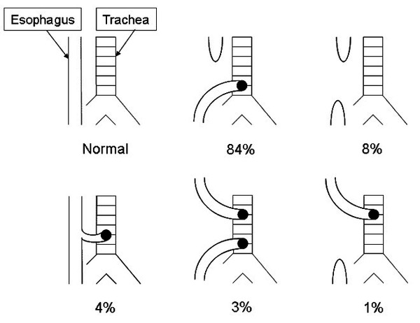 There are several types of EA/TEF, classified by the location of the malformation and the structures that are affected. In more than 80 percent of cases, the lower section of the malformed esophagus is connected to the trachea (EA with a distal TEF). Other possible configurations include having the upper section of the malformed esophagus connected to the trachea (EA with a proximal TEF), connections to the trachea from both the upper and lower sections of the malformed esophagus (EA with proximal and distal TEF), an esophagus that is malformed but does not connect to the trachea (isolated EA), and a connection to the trachea from an otherwise normal esophagus (H-type TEF with no EA).
