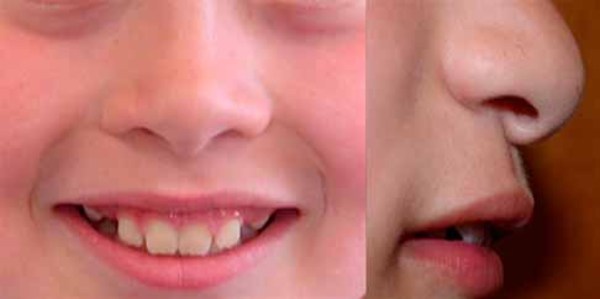 Typical facial features in people with Floating-Harbor syndrome include a triangular face; a low hairline; deep-set eyes; long eyelashes; a large, distinctive nose with a low-hanging separation (overhanging columella) between large nostrils; a shortened distance between the nose and upper lip (a short philtrum); and thin lips. As affected children grow and mature, the nose becomes more prominent.